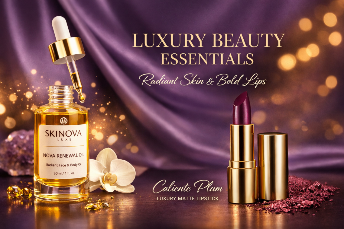 Skinova Luxe Beauti Bar blends sophisticated formulations with luxurious aesthetics, offering glow-enhancing serums and the iconic Caliente Plum lipstick. Each product embodies empowerment, radiance, and a timeless, bold elegance for discerning beauty lovers.